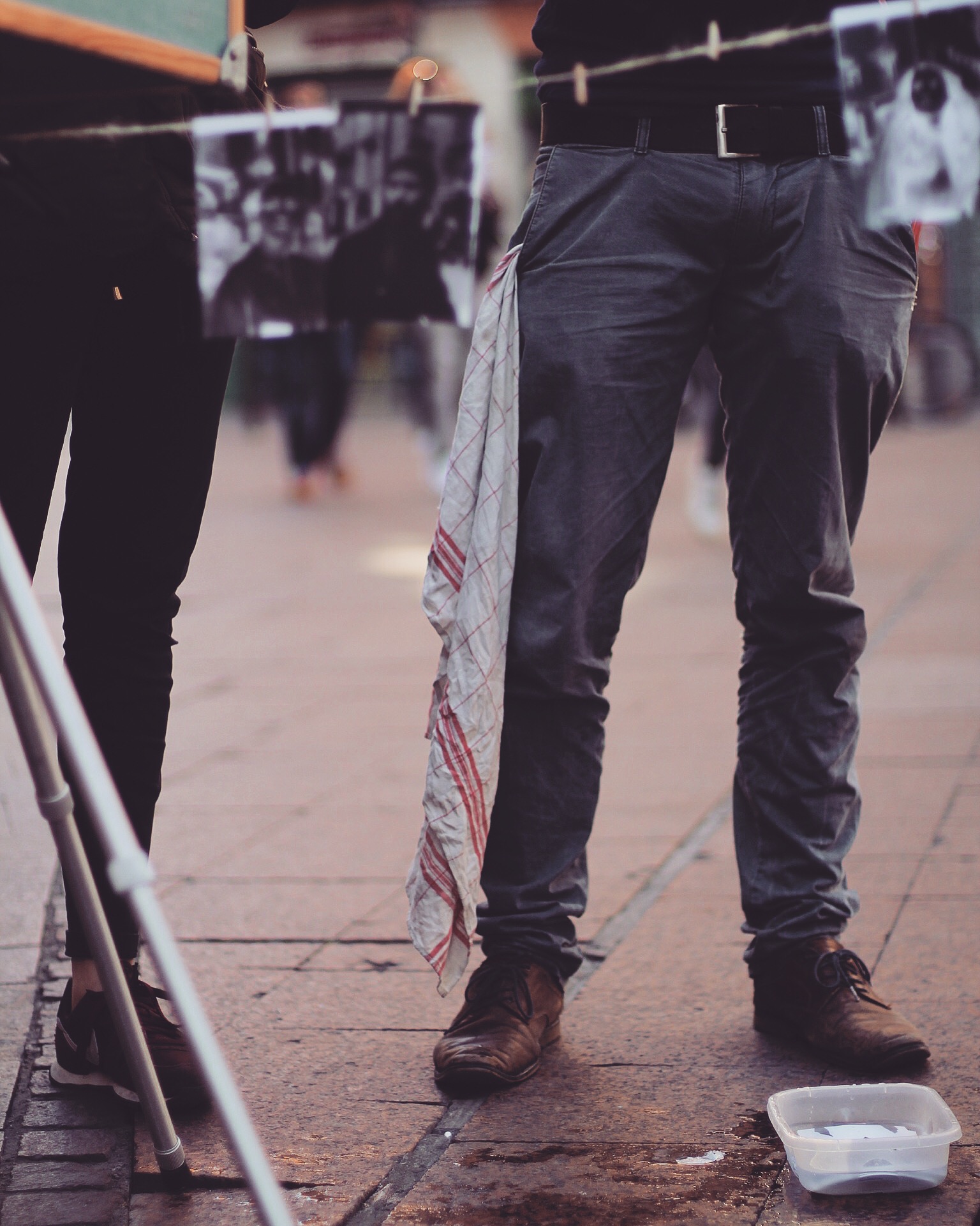 La boite fonctionne grâce aux mécanismes d’un labo argentique et d’une chambre photographique combinés. La boite est fermée hermétiquement à la lumière, et j’accède à l’intérieur grâce à un manchon situé sur le côté. C’est par cet endroit que je fais tous les réglages et les manipulations, à l’aveugle. J’utilise du papier Ilford 10 x 15cm et des chimies classiques de révélateur et fixateur argentique. Je dois d’abord capturer et développer une première photographie qui sera le négatif, puis procéder à un tirage contact, encore une fois dans la boite, pour inverser les valeurs de blanc et de noir, et récupérer la photographie positive, encore une fois développée dans les bacs de chimie pour la donner au modèle. Je garde quant à moi, le négatif, grâce auquel je peux avoir autant de positif que nécessaire, ou que je peux scanner pour faire des séries et/ou agrandissements.