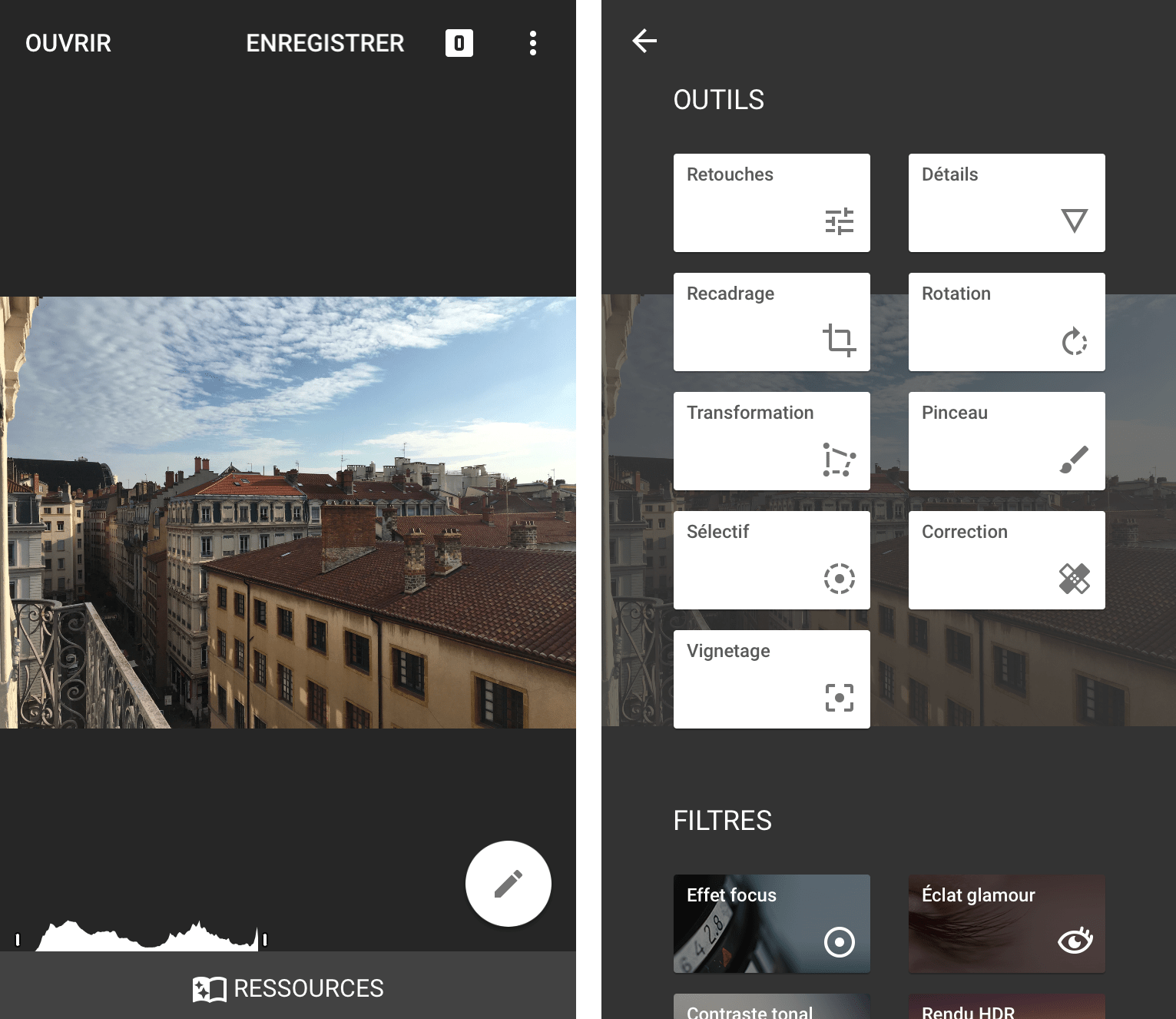 En ouvrant la photo dans l’application snapseed et en naviguant dans les divers outils de retouche, détail etc, vous jouez avec les curseurs de gauche à droite pour assombrir ou éclaircir.
